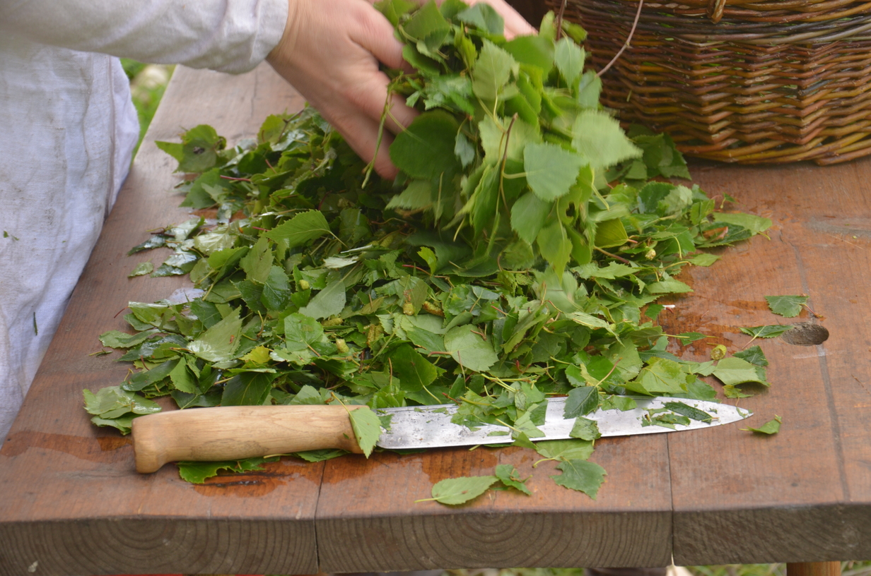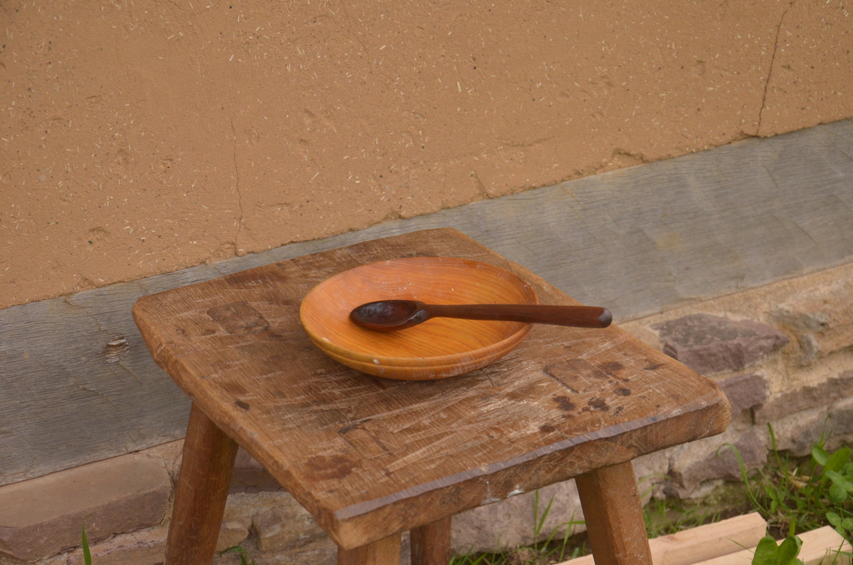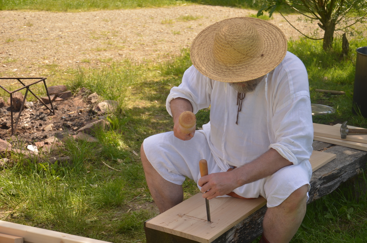 Laura, Ulrike und Pia (das erste mal mit Nachwuchs und Ehemann dabei) wollten färben. Ich hatte mir den Bau eines Hockers vorgenommen, das wunderschöne, 4cm dicke Eichenbrett dafür hatte ich von Katjas (Katharina von Suderburg) Mann geschenkt bekommen. Michael und Uwe hatten jeweils eine Bank aus Eschenholz auf dem Plan…eigentlich hatte jeder etwas um die Ohren. Dazwischen wurde gemeinsam gekocht (Es gab u.a. Spinatpasteten, die Laura und ich mit vor Ort gesammeltem Giersch verfeinert haben), gebacken, geschnackt und abends auch gerne etwas getrunken.