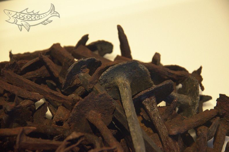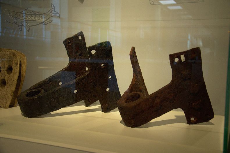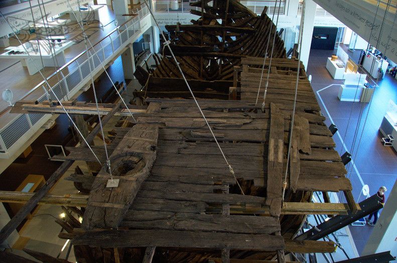 Die Datierung nur anhand des Schiffstyps ist nicht ganz einfach: Dieser Typus kam von der Mitte des 13. bis zum Ende des 14. Jahrhunderts zum Einsatz. Aber wie immer hilft da die Wissenschaft: Dendrochronologie nennt sich das Spezialgebiet, dass der Alterbestimmung von Hölzern gewidmet ist. Das Prinzip ist recht einfach: Bäume bilden je nach Art, Wettereinfluß und Standort charakteristische Jahresringabfolgen aus. Wenn ich ein Referenzholz habe, anhand dessen ich das Jahresringmuster mit meinem Fund vergleichen kann, bin ich fein raus! Klar, immer noch eine aufwändige Detektivarbeit, aber besser als raten. Es stellte sich also heraus, dass das Eichenholz nicht aus dem Bremer Umland, sondern vielmehr aus dem hessischen Raum stammte. Die Qualität des Holzes war auch nicht berauschend: Nicht wenige, von den mittelalterlichen Bootsbauern geflickte Risse wurden identifiziert. Eben keine norddeutsche Eiche :-) Das Datum der Fällung wurde ziemlich genau auf 1378 festgelegt, der Beginn des Bootsbaus kommt also mit ca. 1380 hin.